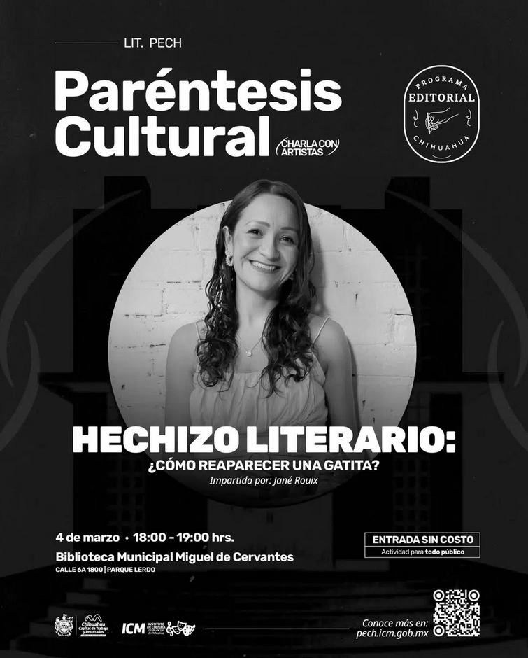 Te invitamos a la charla “Hechizo literario: ¿Cómo reaparecer una gatita?”, impartida por Jané Rouix, como parte de Paréntesis Cultural. 📌